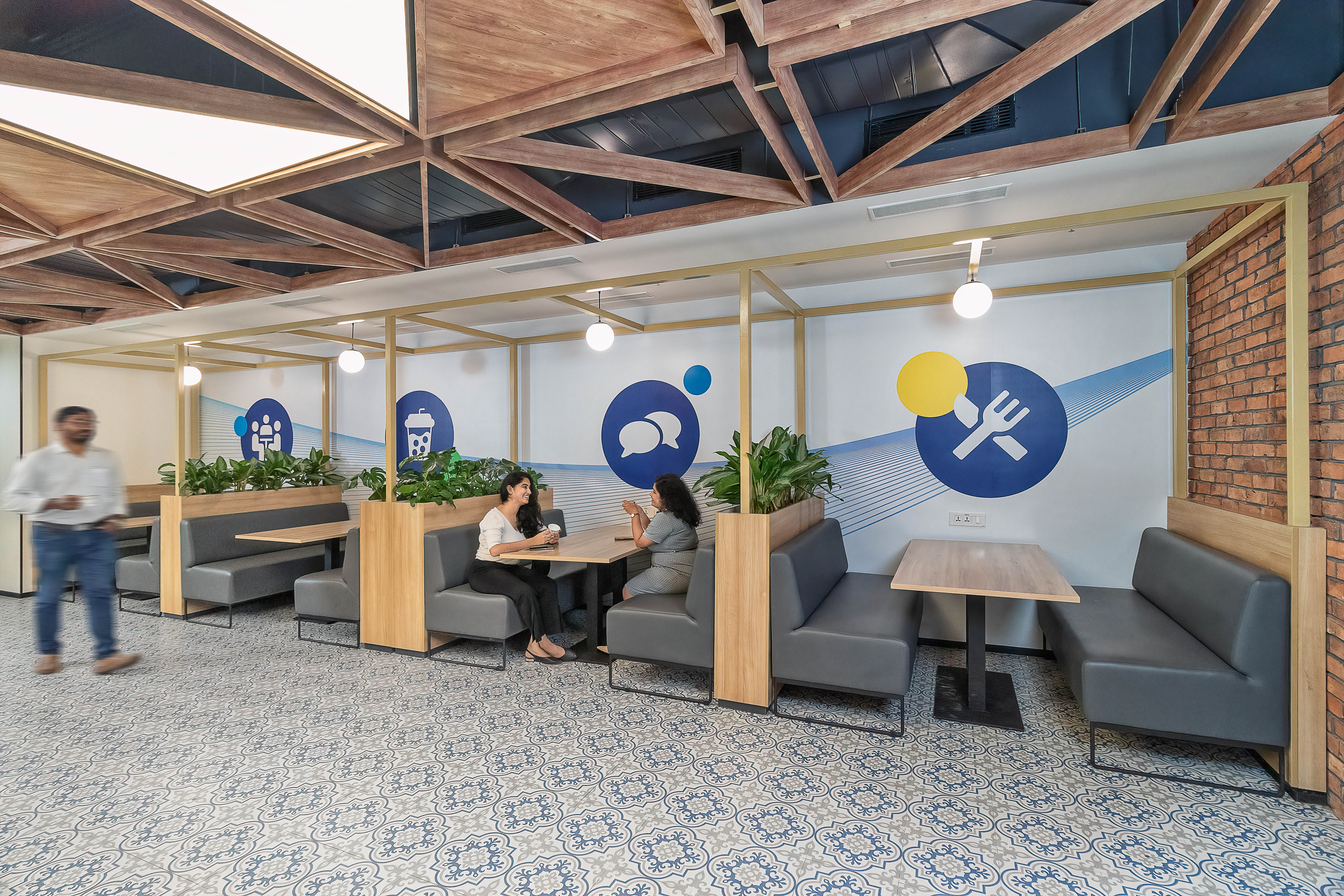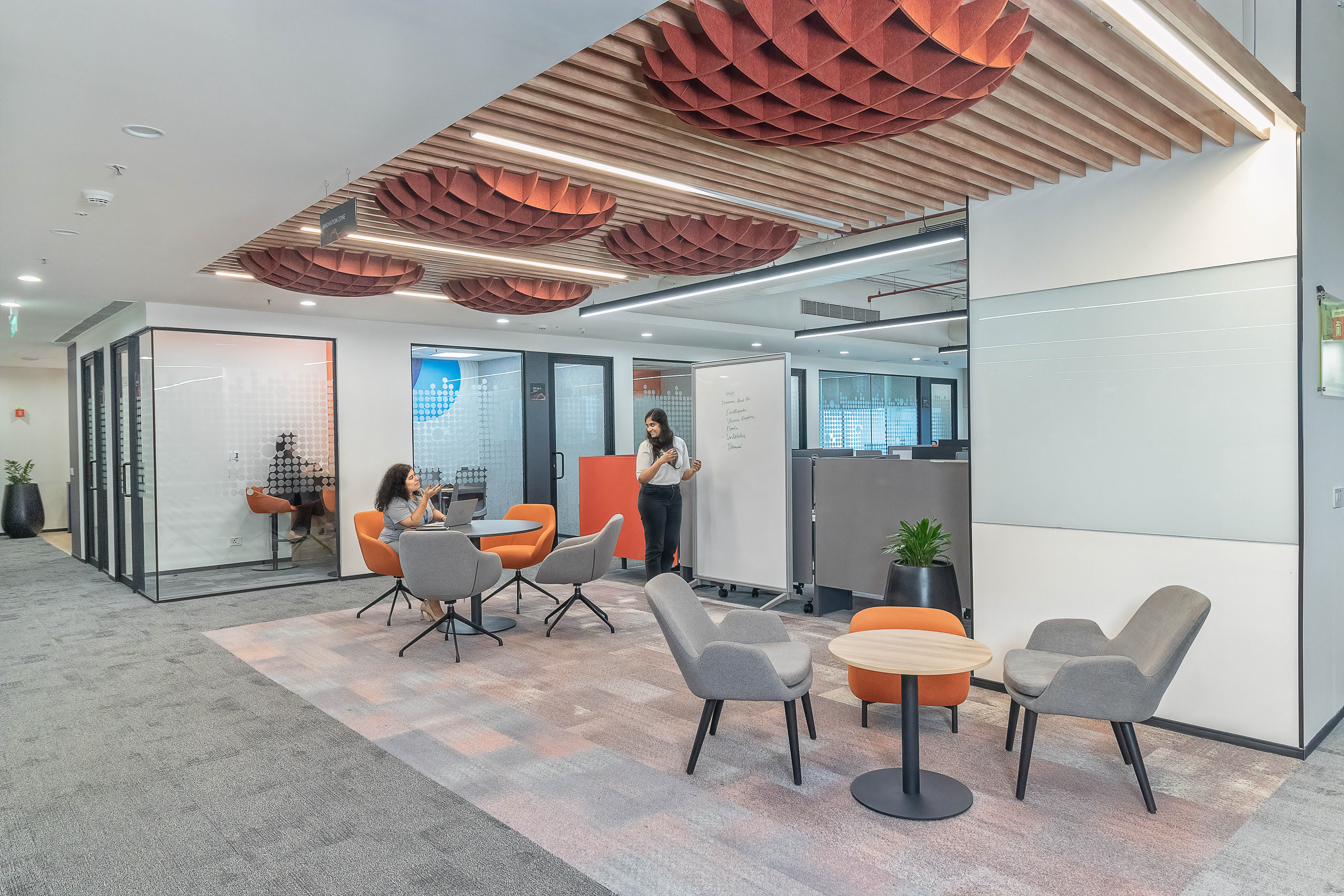 The office layout is meticulously designed to foster collaboration, flexibility, and productivity. From the moment you enter, the sleek, geometric reception area with warm wooden accents sets a welcoming tone, reflecting Verisk's brand ethos. Moving through the open office spaces, employees are offered a variety of workstations, lounges, and collaborative areas that cater to diverse workstyles, all while showcasing the brand’s culture through murals and thoughtful color schemes.